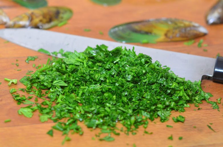 7. Добавляем в масло петрушку, сок лайма, давленный чеснокодавкой чеснок, солим, перчим по вкусу.