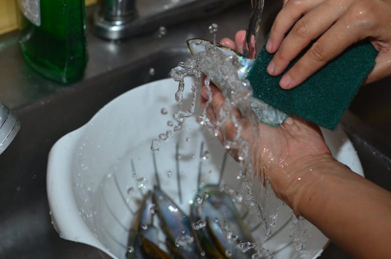 3. Моем с двух сторон, на обратной стороне часто есть водоросли, они легко отмываются жесткой губкой. Чистые ракушки складываем на полотенце, стекать.