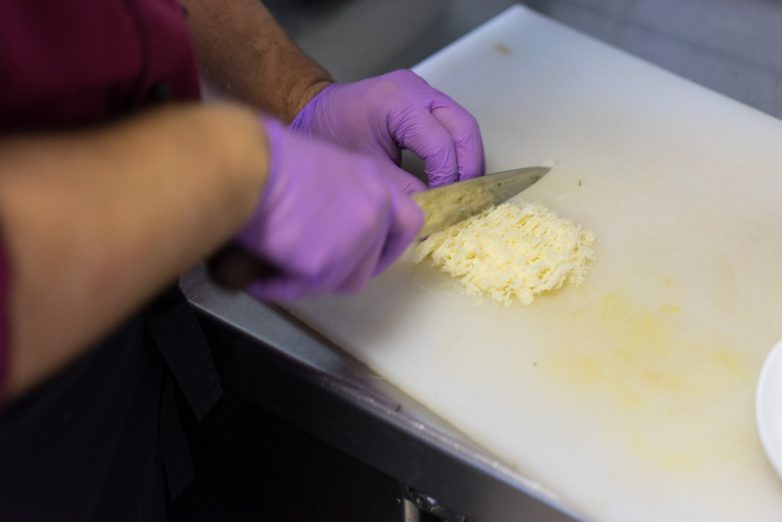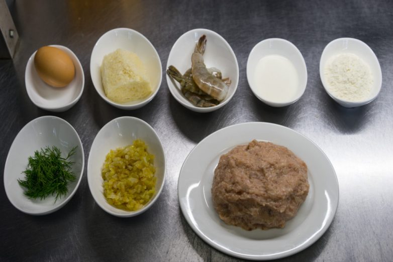 Также мелко порубите креветки (130 г). Они дадут некоторую нежность и аромат.