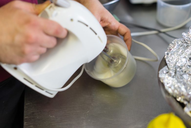 Возьмите белую мякоть багета (65 г) и порубите так мелко, как только сможете. Замочите на пару минут в сливках (40 г, 22-33%).