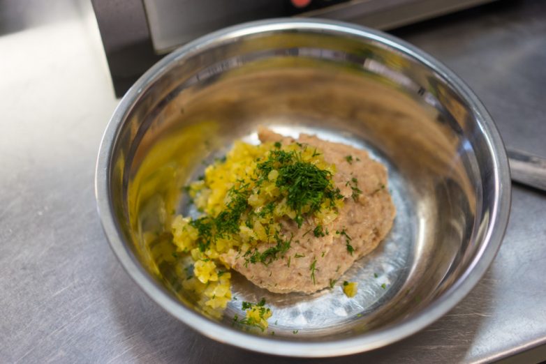 Мелко порубите репчатый лук (145 г) и обжарьте его до золотистого цвета. Добавьте к рыбному фаршу (455 г). Рыбу можно использовать совершенно любую, хорошо подходит ленок, например. Из неё мы и готовили котлеты.