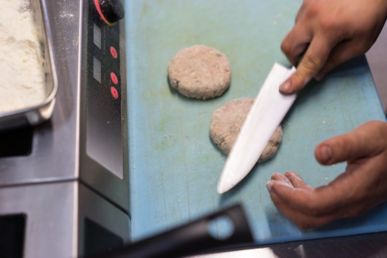 Обваляйте в муке и сформируйте шайбочки. Можете помогать себе ножом.
