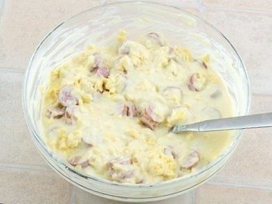 3. Добавить сыр и сосиски, перемешать. Переложить тесто в форму, смазанную маслом (у меня форма 25х25 см).