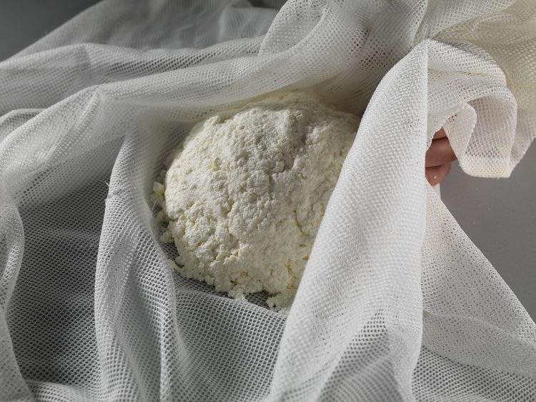 После этого сгусток либо откидывается на дуршлаг, либо поднимается из кастрюли и подвешивается для стекания лишней сыворотки.