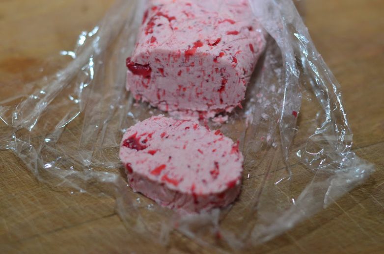 Выложите ложкой на пищевую плёнку и скатайте его в цилиндр, свяжите края, чтобы наш цилиндр был похож на конфетку.