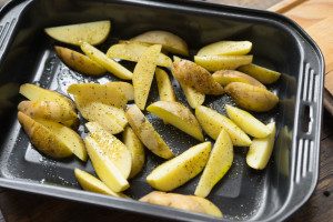 Теперь картошка. Здесь всё ещё проще, но вкус будет просто бомба. Средние картофелины (штук 5) режем на 6 частей. Секрет в том, чтобы дольки были с острым углом на срезе, так вкуснее. Накладываем в форму побольше, сверху оливковое масло, крупная соль и перец.