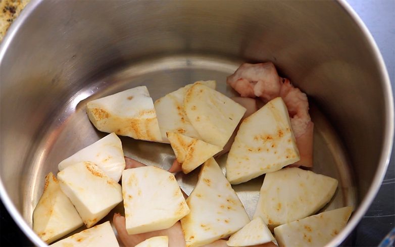 На дно большой кастрюли укладываем срезанные в начале кусочки шкурки с салом и корень сельдерея нарезанный как придётся (толстые пластинки вполне сгодятся – от корня нам нужен только его вкус и аромат). Сало и шкурка укладываются вниз, чтобы исключить малейшую возможность пригорания.