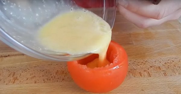 Взбейте яйца и вылейте их в помидоры.