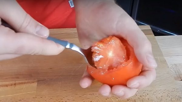 У помытых помидоров срежьте верхушки. При помощи ложки аккуратно вырежьте середину. Помидоры посолите, слегка поперчите изнутри. Смажьте стенки маслом.