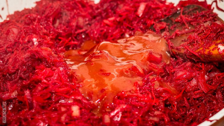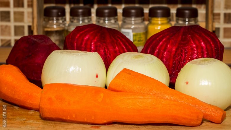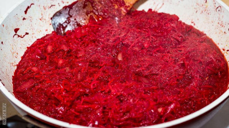 По готовке всё как вы обычно в борщ делаете. Лук, морковь, свекла, томаты и чеснок (если добавляете).
