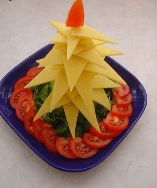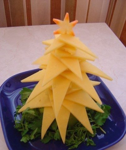 Режем сыр треугольниками разных размеров (сыр должен быть достаточно плотным, и пластичным. Чтобы ломтики не крошились, и не слишком обвисали).