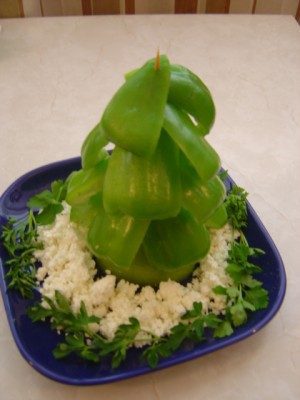 Нарезайте перец так как показано на фото, при этом, вырезая хвостик, постарайтесь не отрезать нижнюю округлую часть перца, она придает ёлочке очень приятную форму.