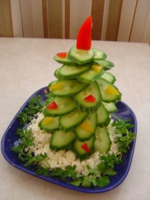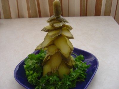 На одну ёлочку примерно уходит 2-4 огурчика. Режем их наискосок, чтобы получить яркий “видимый” краешек из кожицы, инее сильно тонко, чтобы наши “веточки” не обвисали (Последнее относится не ко всем закускам, а именно к соленым и маринованным огурчикам, поскольку они довольно мягкие). Начинаем нанизывать самые крупные ломтики, постепенно переходя к более мелким. Старайтесь насаживать ломтик так, чтобы “наружным” был более красивый край.
