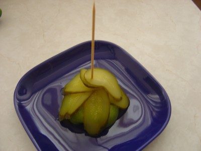 Переворачиваем часть и ложем на тарелку, в центр втыкаем деревянную шпажку острым концом вверх.