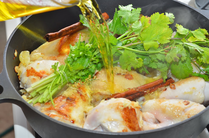 5. Далее солим, перчим, посыпаем имбирем, кладём связанный в пучок кориандр, палочки корицы, заливаем всё шафрановой водой. Закрываем крышкой и тушим на медленном огне примерно 40-60 минут. У меня тажин из ИКЕИ и в духовку он не помещается, поэтому я тушу только на плите. У кого глиняный небольшой тажин, пусть курочка потушится сначала 30 минут на плите, и затем в разогретую духовку ещё на 30 минут.