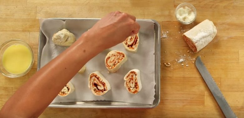 Разрежьте рулет из пиццы на порционные кусочки, смажьте яично-сливочной смесью, присыпьте сыром и запекайте в духовке как обычную пиццу.