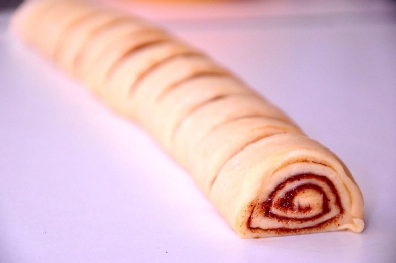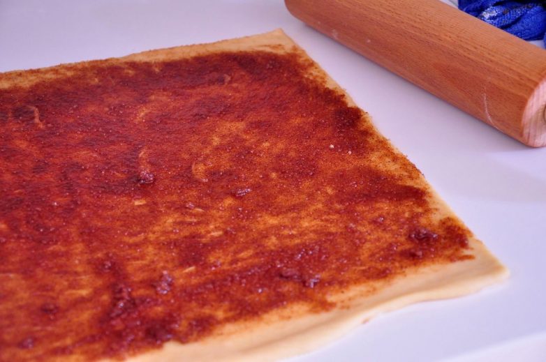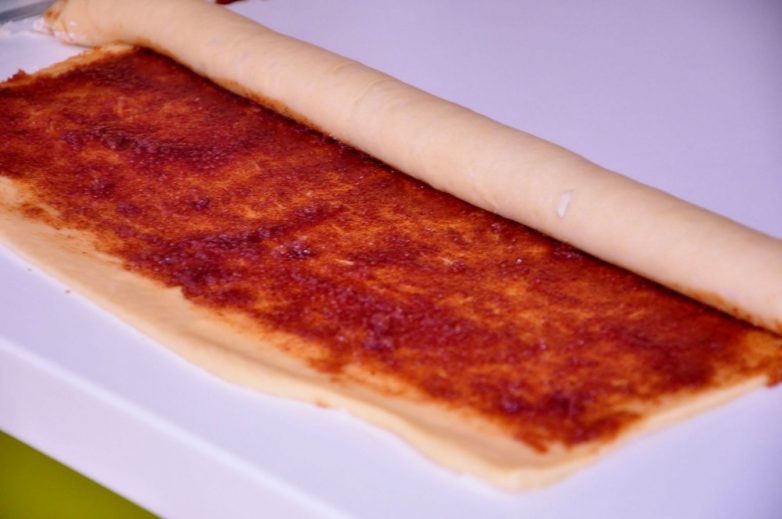 Сворачиваем тесто в рулет, чем плотнее он будет, тем лучше. К примеру, в классических синнабонах ровно 5 завитков, у меня получилось 4.