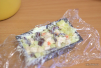 Приготовить форму(ы) для терринов/кексов. Обернуть со всех сторон пищевой пленкой, так чтобы, когда её будем наполнять, тяжесть майонеза не стянула всю пленку вниз — на дно. Убрать в морозильную камеру заготовки на 20-30 минут. Она должна быть очень холодная, тогда будет легко покрыть её слоем майонезного желе – оно будет сразу застывать.