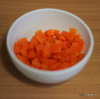 Кубиками нарезать куриную грудку. Можно использовать куриную ветчину или любое вами любимое мясо.