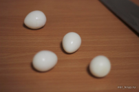 Отварить до готовности перепелиные яйца, аккуратно их очистить.