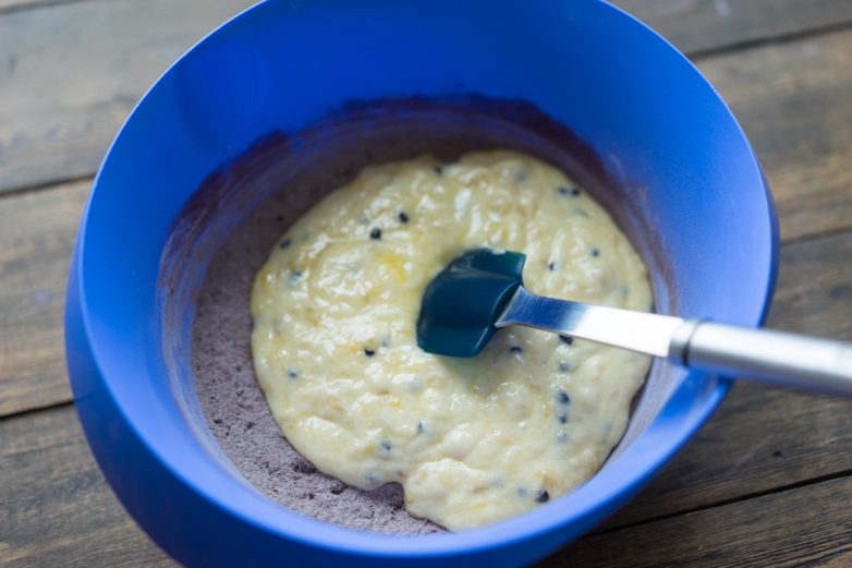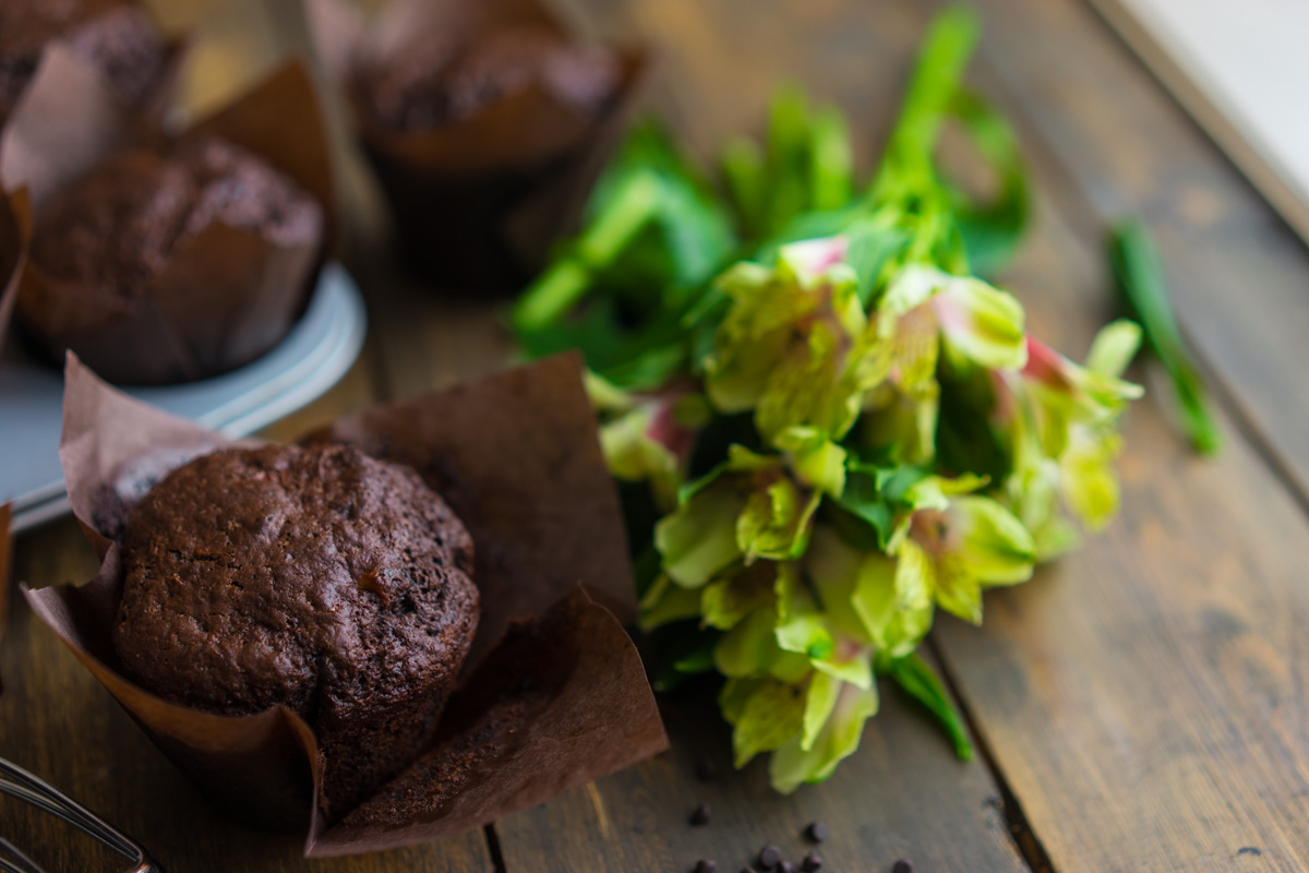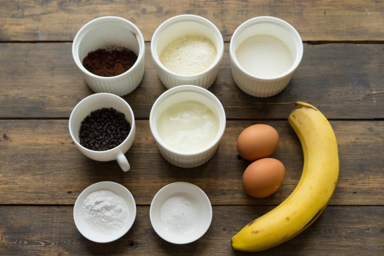 А уж если вы страдаете зависимостью от шоколада — сегодняшний рецепт определённо для вас. Всё в этих маффинах идеально. Плотный пористый мякиш, разламываешь маффин и хочется всем показать, какой он сочный и с красивыми пузырьками. Очень шоколадный, не приторный, аромат. И главное, банановое пюре, которое делает выпечку сочнее. Я нашел оптимальное количество банана и использовать будем крепкий, а не переспевший. На выходе у вас чуть липкое внутри тесто с небольшими кусочками бананов.