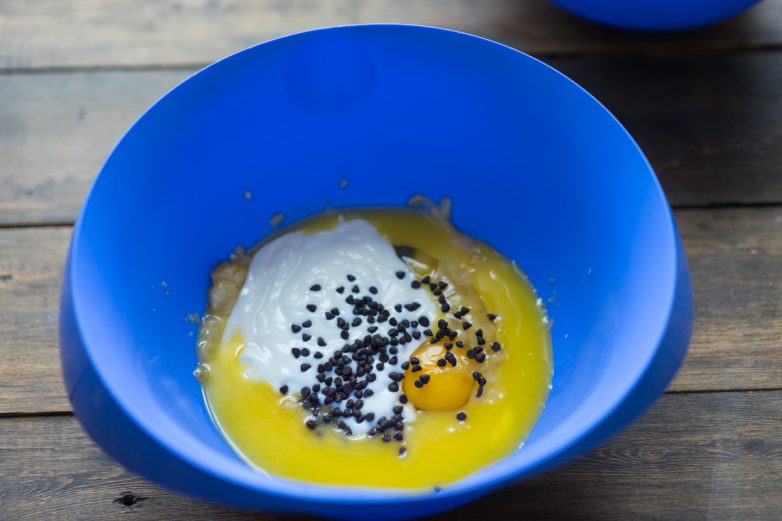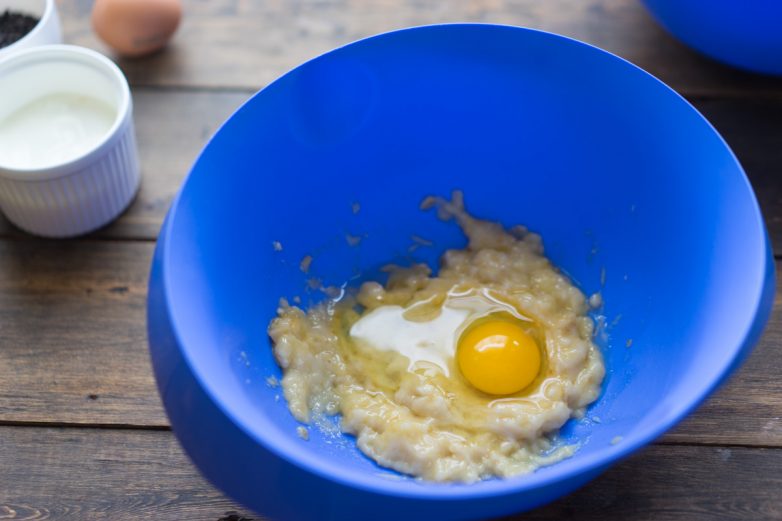 Во второй разомните один большой банан (можно два средних). Обычно в рецептах говорят «возьмите переспевшие бананы», ерунда. Наоборот берите хороший крепкий, и разомните его вилочкой или картофелемялкой. Останутся крупные кусочки — да ещё вкуснее будет. В эту же чашу добавляем два яйца.
