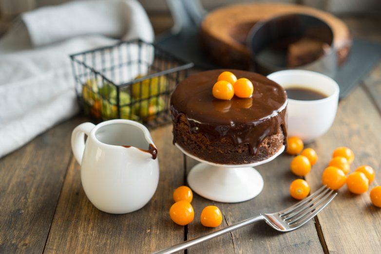 14. Вырежьте из готового торта порционные пирожные ножом или кольцами, полейте ганашом и украсьте ягодами. Можно и не вырезать, тогда получится хороший торт.