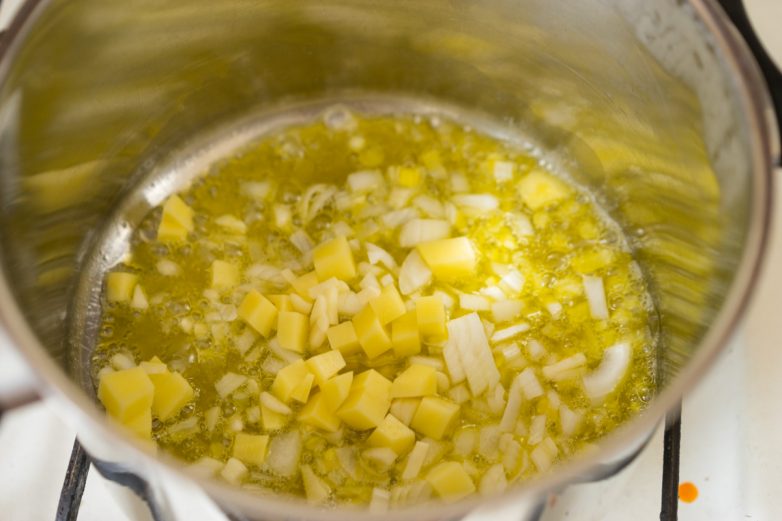 В кастрюле на среднем огне нагреваем оливковое (50 г) и сливочное (25 г) масло. Может не все ещё знают, но оливковое очень хорошо выдерживает температуры, поэтому оно спасает сливочное от подгорания. А в итоге у нас будет вкусная и ароматная зажарка.