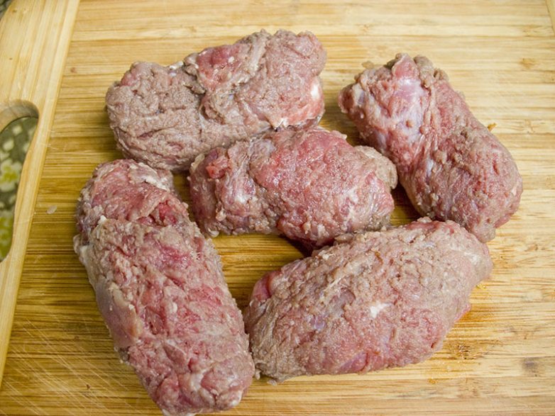 Аккуратно свернул лепешки, чтобы получились вот такие котлетки. Хорошо обжать со всех сторон, чтобы мясо плотно облегало начинку. Обычно зразы обваливают в муке и скрепляют деревянными шпажками, чтобы при жарке они не раскрылись, но я делаю по другому. Зразы выдерживаю в холодильнике примерно 30 минут, за это время мясная оболочка становится довольно прочной.