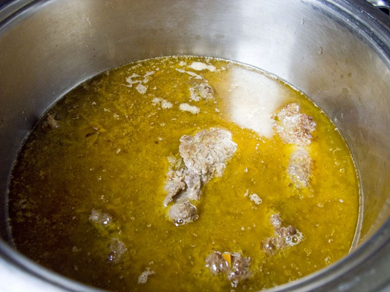 Вот примерно такой кондиции. Для того, чтобы получить именно такой карамелизированный лук, его нужно поджаривать в достаточном количестве масла на среднем огне, а к концу жарки огонь убрать до малого и довольно часто размешивать. Можно к концу жарки присыпать небольшое количество коричневого сахара — примерно 1 чайную ложку на луковицу. После жарки лук убираю из сковородки, оставляя в ней масло, на котором он жарился.