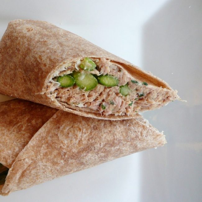 Нарезать стебель сельдерея и болгарский перец. Намазать лаваш йогуртом, выложить на него тунец, овощи и шпинат, сбрызнуть лимонным соком и завернуть в трубочку.