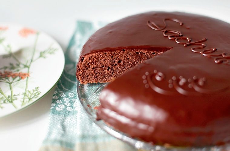 13. Растопите оставшийся шоколад, переложите массу в корнетик, срежьте кончик и напишите на торте название Sacher.