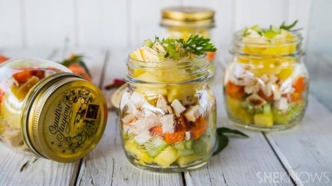 В банки выложите последовательно соус, помидорки черри, огурцы, лук, сыр, ветчину и рукколу. Плотно закройте крышкой.