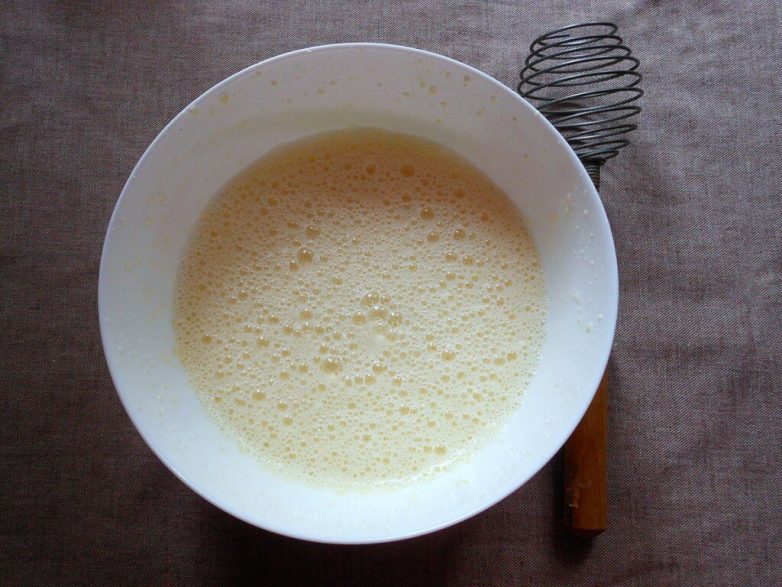 3. Продолжая взбивать, медленно добавьте теплую молочную смесь.