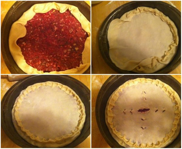 Духовку разогрейте до 200 °С. Выпекайте пирог сначала на нижнем уровне духовки (7 мин. приблизительно), а когда тесто отстанет от формы, переместите изделие на средний уровень еще на 20–25 мин. В середине выпекания осторожно добавьте пару ложек бульона в отверстие пирога.