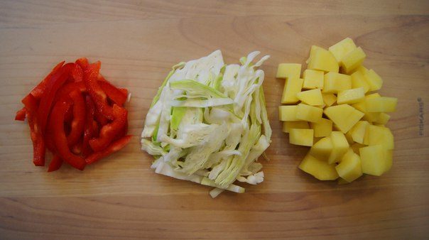 Так как капуста молодая, с нежными листьями, то буквально через 5 минут добавляем к мясу и овощам нарезанную кубиками картошку.