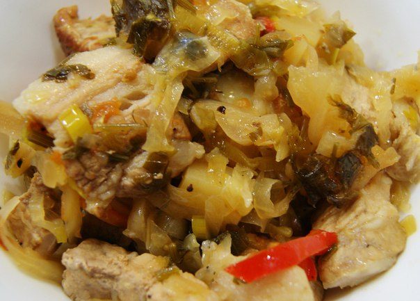 обжаренное мясо, нашинкованную капусту, заливаем кипящей водой или бульоном. Присаливаем. Устанавливаем режим