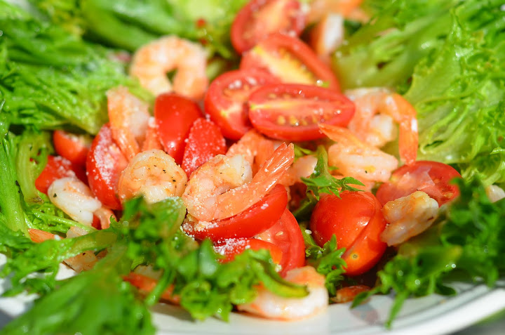 4. В тарелку выкладываем листья салата, нарезанные помидоры. Сверху креветки.