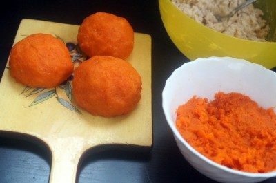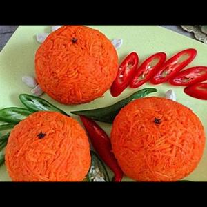Каждый шарик тщательно, без пробелов облепить нашей морковкой, выровнять.