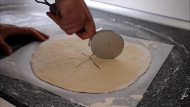 С помощью маленького круглого блюдца и обычной зубочистки нарисуйте кружок в самом центре раскатанного теста.