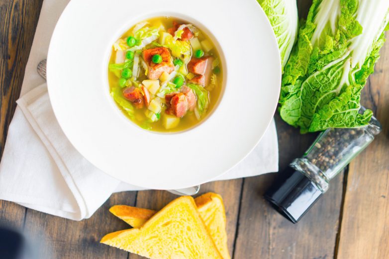 Очень ароматный немного мутный бульон насыщенно овощного вкуса, крупные кусочки грудинки, которые передали свою пикантность всему блюду, а структурой сделали суп обьемнее, тонкие полоски ярко-зелёной пекинской капусты, которая значительно нежнее обычной, что лишь улучшает вкус, кубики картофеля (а куда без него) и яркие вкрапления горошка, который вообще любое блюдо живее делает, а здесь он связующее звено между мягкой капустой и приятно жестковатыми кубиками мяса.