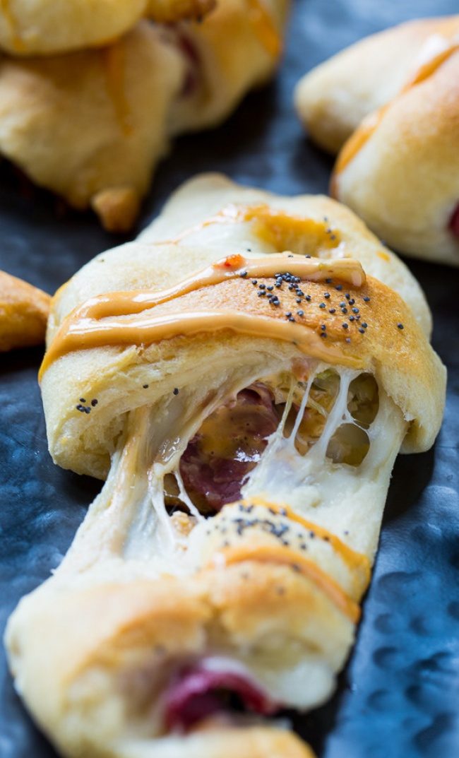 Духовку разогреть до 190 °C.Нарезать тесто на 8 равных треугольниковНа каждый треугольник выложить по кусочку солонины, сыра и немного квашеной капусты. Сверху сбрызнуть соусом.Завернуть каждый треугольник в трубочку, начиная с широкого конца. Выложить все трубочки на смазанный маслом противень. Выпекать в духовке около 12 минут.