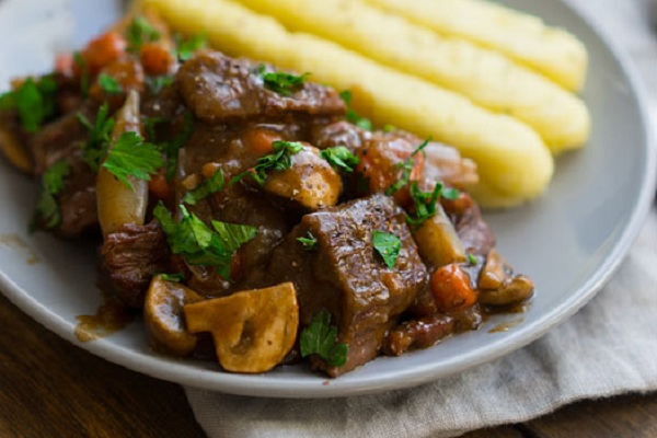 Бёф бургиньон — (говядина по-бургундски) — традиционное, но не широко распространённое блюдо французской кухни. Готовится из тушёных, слегка обжаренных кусочков говядины в густом винном соусе на говяжьем бульоне, приправляется чесноком, луком, морковью, грибами.
