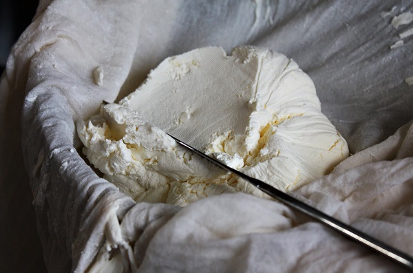 Концы ткани соедините и подвесьте, чтобы стекла сыворотка. Если вы делали однажды домашний творог, этот этап будет уже знаком. Дополнительно на сверток надавливать не нужно, иногда лишь разворачивайте его и ложкой снимайте остатки сливок со стенок и сбрасывайте в серединку.