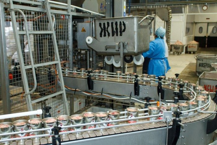 Из чанов заранее подготовленное мясо автоматизировано подается мясо в машину-дозатор, которая укладывает каждый кусочек мяса в баночку.