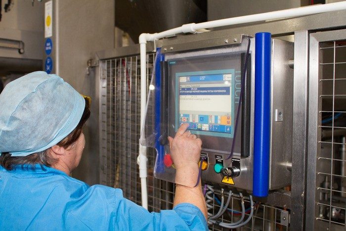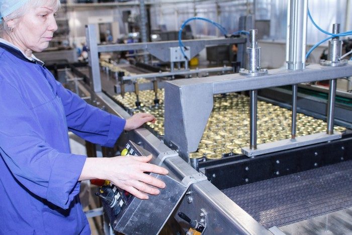 После того, как мясо оказалось в баночке, она герметично закатывается в специальной машине. У этого оборудования тоже один оператор, который ровно выставляет на каждую баночку крышки.