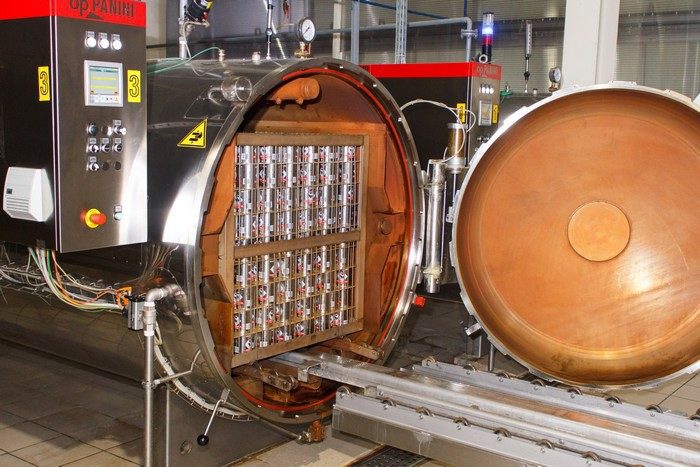 После того, как продукт герметично упакован, консервную банку снова моют и отправляют в накопитель. На этом этапе в тщательно вымытых банках находятся все еще сырые продукты — теперь нужно все это нужно приготовить. Для этого банки укладывают в коробки и при помощи масштабной конструкции с космическим названием «Шатлл» отправляют в автоклав. Здесь в течении нескольких часов проходит процесс стерилизации — одновременно тепловому воздействию подвергаются по 1700 баночек продукта.