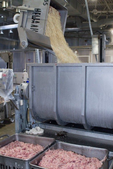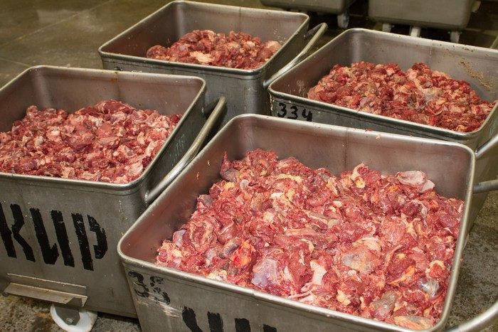 Самый главный продукт в любой качественной тушенке, конечно же, мясо. Мясо для приготовления тушенки на БМП доставляется из экологически чистых районов Бурятии и Монголии. Прежде чем попасть в цех, сырье проходит тщательный входной лабораторный и ветеринарный контроль. После входного контроля и визуального осмотра мясное сырье направляют на разделку, обвалку и жиловку. Жилованное мясо измельчают на специальных волчках на куски массой по 50-120 граммов каждый.