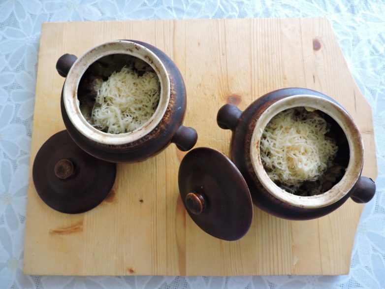 За 10 минут до готовности добавить сыр и опять поставить горшочки в духовку с открытыми крыжками