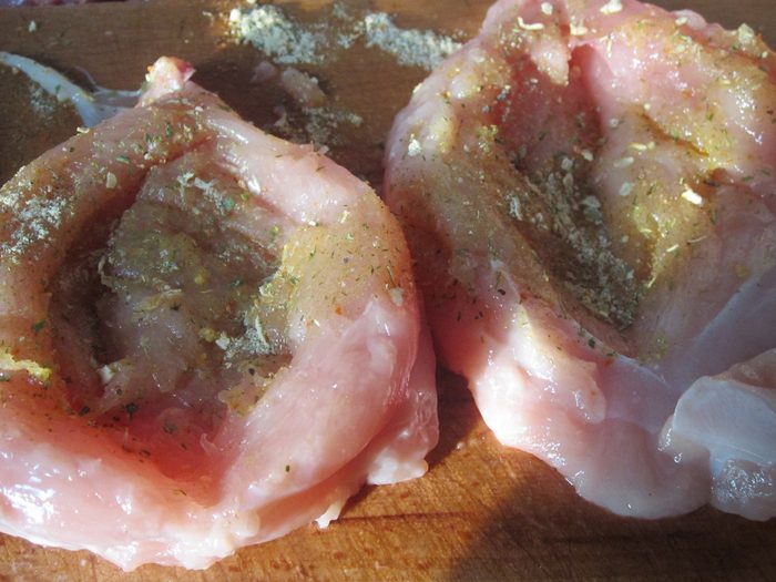 Куриную грудку я разрезала на четыре порции. Остальные кусочки филе более мелкие использовала для приготовления обычных шницелей.